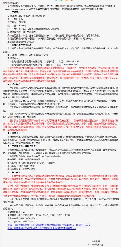 2024年10月11日中儲糧浙江分公司玉米競價銷售專場公告
