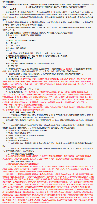 2024年10月12日中儲糧江西分公司玉米購銷雙向競價交易專場公告