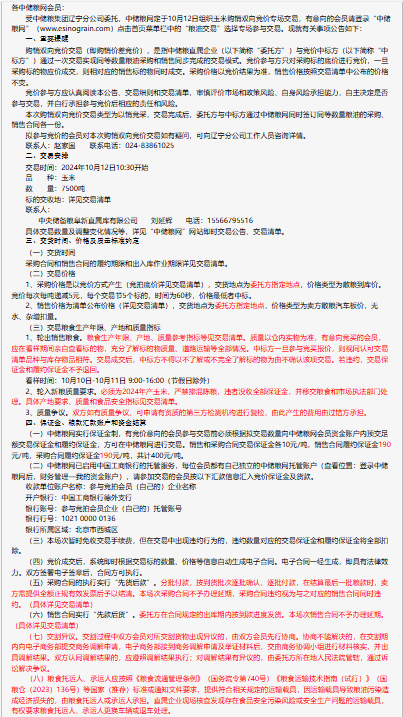 2024年10月12日中儲糧遼寧分公司玉米購銷雙向競價交易專場公告