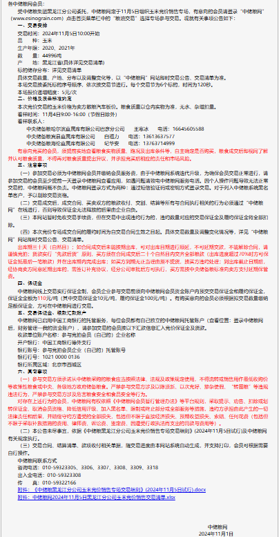 2024年11月5日中儲糧黑龍江分公司玉米競價銷售專場公告