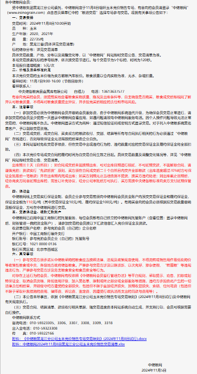 2024年11月8日中儲糧黑龍江分公司玉米競價銷售專場公告