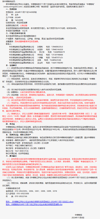 2024年11月11日中儲糧遼寧分公司玉米競價采購專場公告