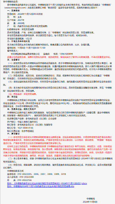 2024年11月12日中儲糧內蒙古分公司玉米競價銷售專場公告