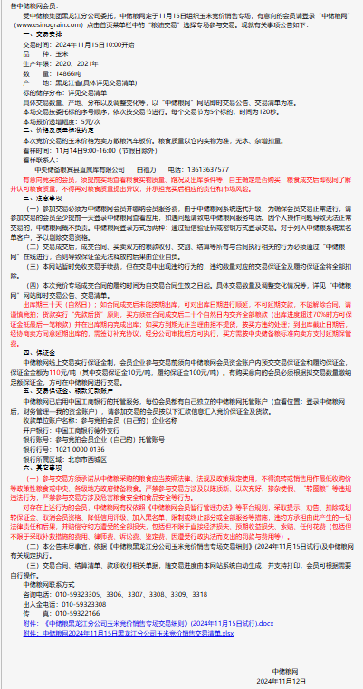 2024年11月15日中儲糧黑龍江分公司玉米競價銷售專場公告