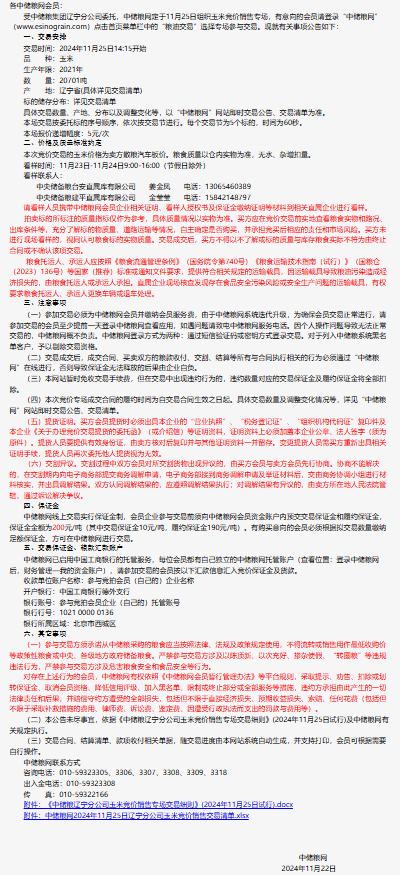 2024年11月25日中儲糧遼寧分公司玉米競價銷售專場公告