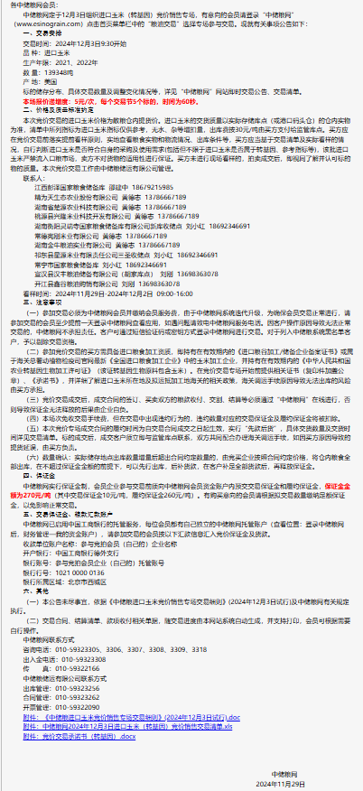 2024年12月3日中儲糧進口玉米(轉基因)競價銷售專場公告