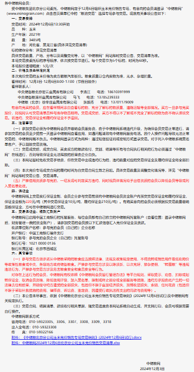 2024年12月6日中儲糧北京分公司玉米競價銷售專場公告