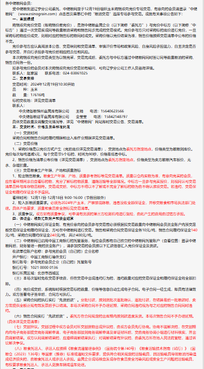 2024年12月19日中儲糧遼寧分公司玉米購銷雙向競價交易專場公告