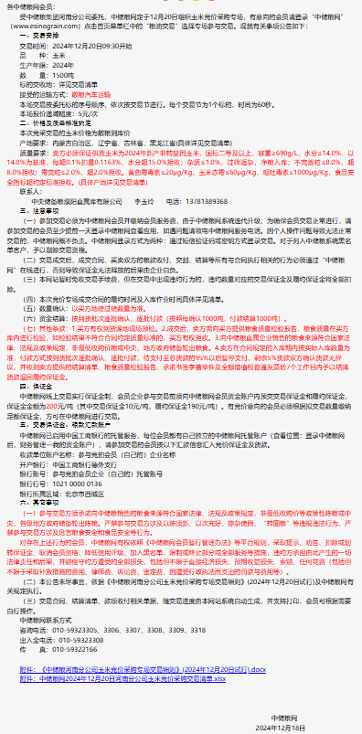 2024年12月20日中儲糧河南分公司玉米競價采購專場公告