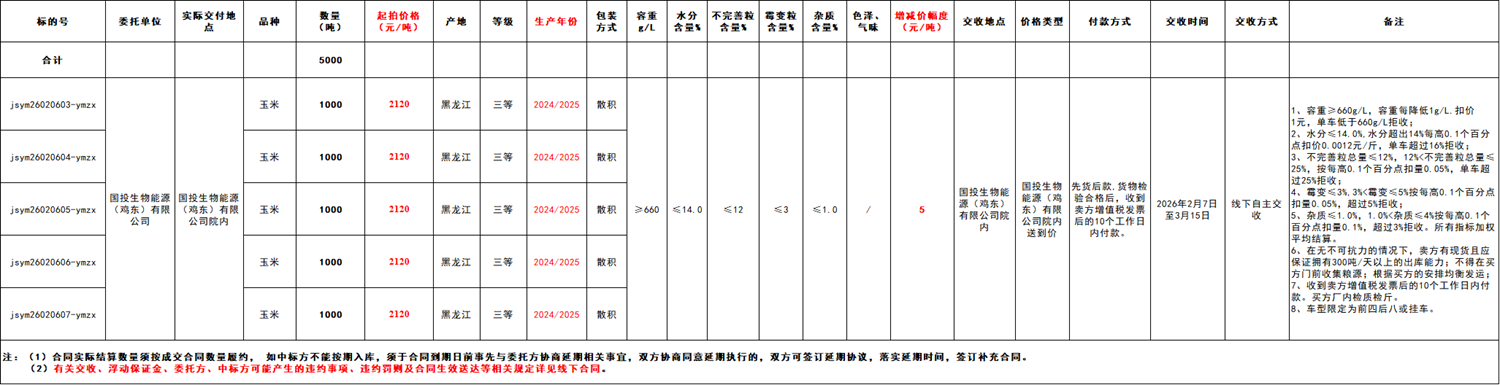 受國投生物能源(雞東)有限公司委托,江蘇糧油商品交易市場暨玉米分中心定于2026年2月6日 14:00在“玉米分中心競價采購交易專場”舉辦本次玉米競價采購交易活動。具體事宜公告如下: