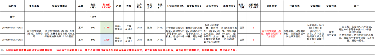 2.本次競價采購交易起拍價:詳見交易清單,競價幅度為人民幣5元/噸。交易價格類型為吉林生物能源(榆樹)有限公司送到價。