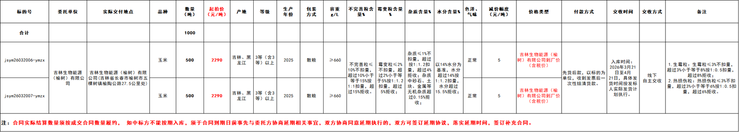 2.本次競價采購交易起拍價:2290元/噸,競價幅度為人民幣5元/噸。交易價格類型為吉林生物能源(榆樹)有限公司送到價。