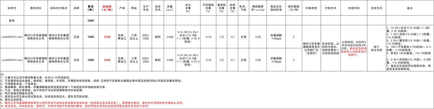 2.本次競價采購交易起拍價:2340元/噸,競拍減價幅度為人民幣5元/噸。交易價格類型為梅河口市阜康酒精有限責任公司到廠價格(含稅)。