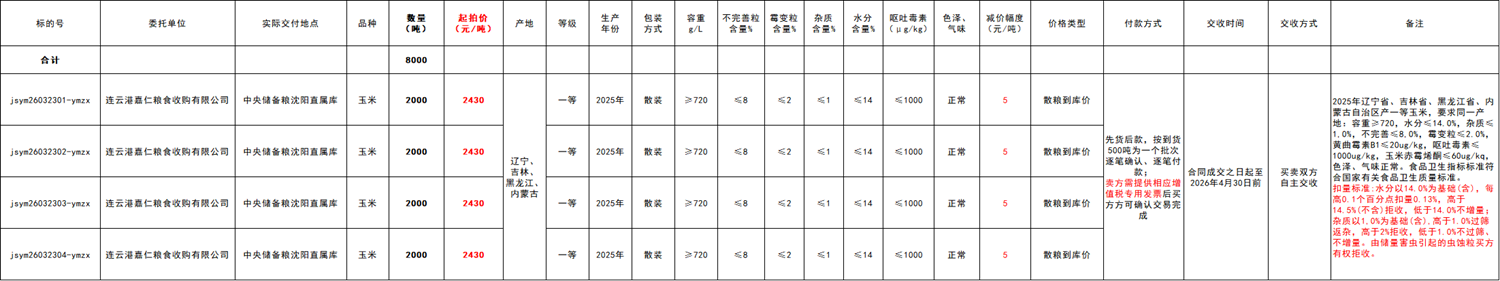 2.本次競價采購交易起拍價2430元/噸,競價幅度為人民幣5元/噸。交易價格類型為 中央儲備糧沈陽直屬庫散糧到庫價。
