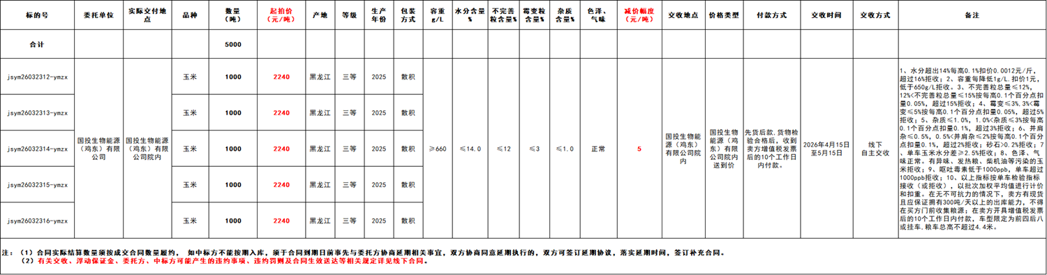 受國投生物能源(雞東)有限公司委托,江蘇糧油商品交易市場暨玉米分中心定于2026年3月23日 14:00在“玉米分中心競價采購交易專場”舉辦本次商品玉米競價采購交易活動。具體事宜公告如下: