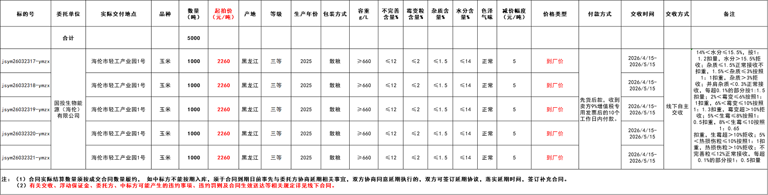 受國投生物能源(海倫)有限公司委托,江蘇糧油商品交易市場暨玉米分中心定于2026年3月23日14:30 在“玉米分中心競價采購交易專場”舉辦本次玉米競價采購交易活動。具體事宜公告如下: