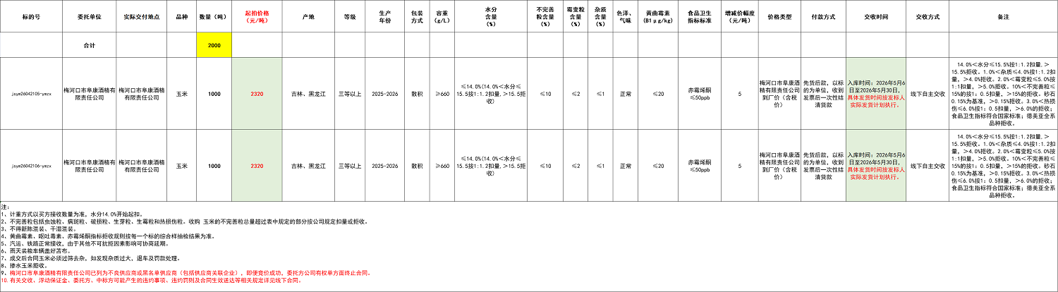 2.本次競價采購交易起拍價:2320元/噸,競拍減價幅度為人民幣5元/噸。交易價格類型為梅河口市阜康酒精有限責任公司到廠價格(含稅)。