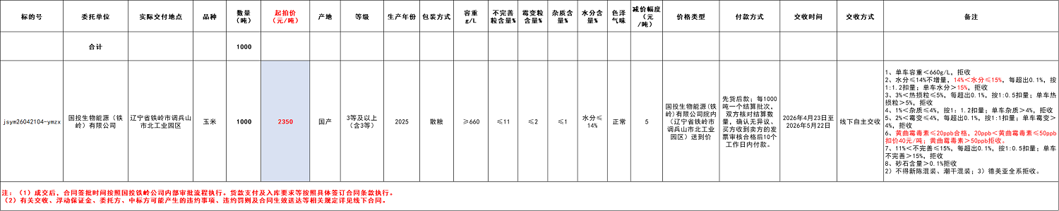 2.本次競價采購交易起拍價:2350元/噸,競拍減價幅度為人民幣5元/噸。交易價格類型為國投生物能源(鐵嶺)有限公司院內(遼寧省鐵嶺市調兵山市北工業園區)送到價。