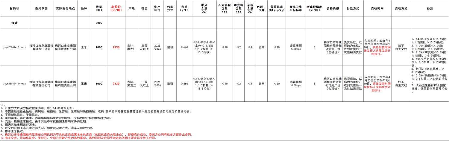 2.本次競價采購交易起拍價:2330元/噸,競拍減價幅度為人民幣5元/噸。交易價格類型為梅河口市阜康酒精有限責任公司到廠價格(含稅)。