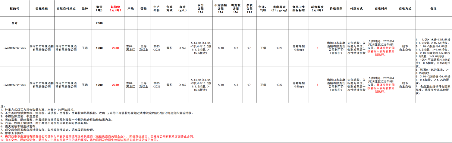 2.本次競價采購交易起拍價:2330元/噸,競拍減價幅度為人民幣5元/噸。交易價格類型為梅河口市阜康酒精有限責任公司到廠價格(含稅)。