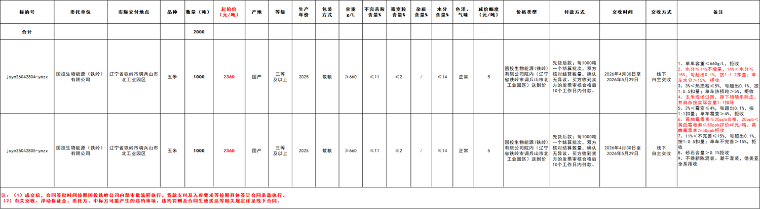 2.本次競價采購交易起拍價:2360元/噸,競拍減價幅度為人民幣5元/噸。交易價格類型為國投生物能源(鐵嶺)有限公司院內(遼寧省鐵嶺市調兵山市北工業園區)送到價。