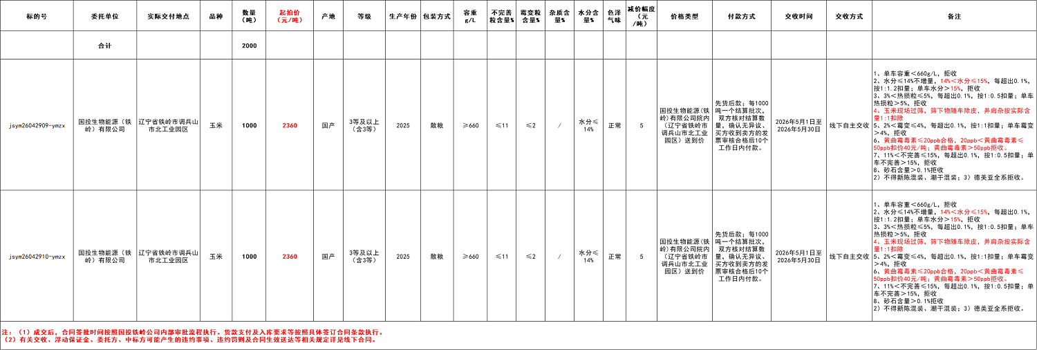 2.本次競價采購交易起拍價:2360元/噸,競拍減價幅度為人民幣5元/噸。交易價格類型為國投生物能源(鐵嶺)有限公司院內(遼寧省鐵嶺市調兵山市北工業園區)送到價。