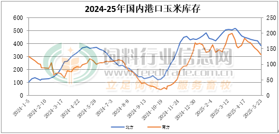 截至5月23日北方港口四港玉米庫存共計約380萬噸。東北產地看漲氣氛減弱,北方港口集港量小幅增多。截止周五廣東港口玉米庫存131萬噸,到貨有所減少,購銷仍較為清淡,內貿玉米日均出貨在1.2萬噸。
