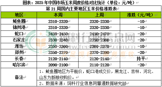 國內主產區受新麥將大面積收獲上市影響,部分貿易商陸續為滕庫加快出貨節奏,市場流通糧源較前期增多,而下游產品走貨偏慢利潤不足,小麥替代優勢逐漸顯現,用糧企業出現階段性觀望氛圍,采購積極性減弱,收購價格滯漲回落東北產地持糧主體挺價情緒松動,北方港口到貨成本略降,政策糧輪換及小麥對玉米替代等因素壓制,加之盤面走弱拖累,貿易商挺價心態趨弱,收購價格小幅下調,其中錦州港周比下跌10元/噸;南方港口受政策傳言影響飼料企業觀望情緒濃厚,采購心態相對謹慎,市場購銷偏清淡,貿易商報價走弱,不過到貨成本及南北貿易即期理論利潤繼續倒掛,價格跌幅相對有限,其中蛇口港周比下跌20元/噸。國內玉米現貨價格基本穩定,局部價格小幅下跌。東北產區基層余糧所剩不多,其中黑龍江、內蒙古余糧基本售罄,吉林、遼寧還有少量待售。政策糧拍賣投放力度持續加大,受盤面持續走弱影響,部分持糧主體出糧積極性提高,深加工企業利潤被壓縮,收購價格試探性小幅下調,其中哈爾濱周比下跌20元/噸;華北黃淮產區新小麥陸續開始收割,小麥替代性價比高,一定程度擠壓玉米需求市場份額,部分飼料企業采購轉向小麥,加上進口拍重啟傳聞影響,部分持糧主體逢高套現出貨積極性提高,出糧量維持在相對高位水平,東北糧源也不斷補充市場,深加工企業廠門到貨維持在相對高位水平,企業收購價格偏弱調整,其中濰坊周比下跌10元/噸。