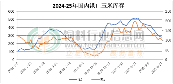 截至6月27日北方港口四港玉米庫存共計約280萬噸。東北產地基層剩糧所剩不多,北方港口晨間集港量不足一萬噸,庫存繼續消耗。截止周五廣東港口玉米庫存103萬噸,飼企維持偏低庫存,剛需采購執行合同為主,內貿玉米日均出貨在2.8萬噸。