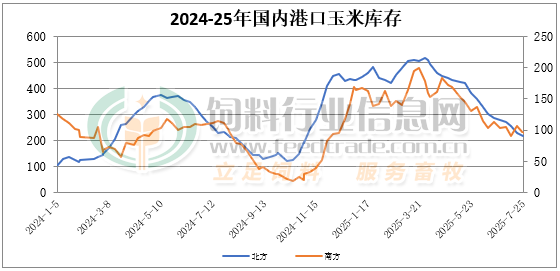 截至7月25日北方港口四港玉米庫存共計約218萬噸。北方港口貿易商運作也較為謹慎,主要執行合同訂單,庫存繼續消耗。截止周五廣東港口玉米庫存95萬噸,多數飼料企業玉米、小麥庫存相對充足,采購需求相對有限,內貿玉米日均出貨在3.7萬噸。