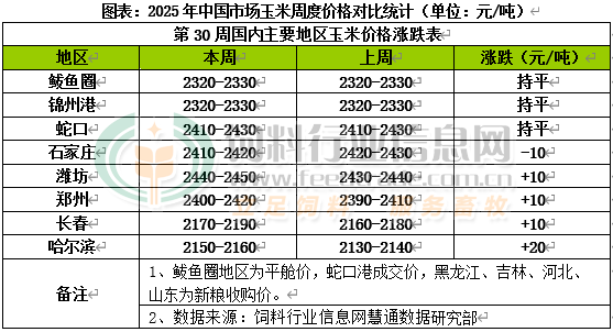 國內主產區迎來持續降雨天氣,經歷前期積極走貨后糧源存量明顯下降,持糧主體惜售心態升溫,市場整體供應偏緊的局面仍在延續,不過小麥在部分區域仍具替代優勢,需求端養殖利潤一般,深加工持續虧損,用糧企業大規模補庫動力不足,現貨價格上行空間有限。產地玉米庫存大幅減少,貿易商出貨意愿偏低,北方港口到貨整體仍處于較低水平,下游走貨緩慢,貿易商收購積極性不強,價格整體穩定,其中錦州港周比持平;南方港口小麥船期持續增加、臺風影響港口作業,飼企持觀望心態,維持剛性采購需求,但受北港到貨成本支撐,貿易商報價相對穩定,其中蛇口港周比持平。國內玉米現貨價格基本穩定,局部價格小幅震蕩。東北產區進口玉米拍賣成交率繼續走低,市場看空情緒有所減弱,此外經過一段時間的售糧,可售余糧庫存也明顯下滑,貿易商挺價惜售心態增強,出貨速度有所放緩,部分企業小批量補庫,收購價格小幅上調,其中哈爾濱周比上漲20元/噸;華北黃淮產區高溫天存糧保管不易,貿易商在利潤的情況下出貨積極性增加,貿易庫存持續消耗,持糧主體惜售情緒升溫,糧源上量出現減少趨勢,市場供應相對吃緊,疊加強降雨天氣持續,玉米上量相對困難,加工企業廠門到貨較少,部分企業庫存偏低,收購價格持續上調,其中鄭州周比上漲10元/噸。