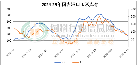 截至8月15日北方港口四港玉米庫存共計約174萬噸。北方港口集港量偏低,市場購銷較冷清,貿易主體收糧積極性低。截止周五廣東港口玉米庫存75萬噸,受部分糧源發熱及船期堆積影響,飼企維持剛需采購,內貿玉米日均出貨在3.5萬噸。