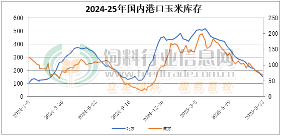 截至8月22日北方港口四港玉米庫存共計約150萬噸。北方港口集港量低于下海量,港存繼續下降。截止周五廣東港口玉米庫存75萬噸,飼企消耗庫存,采購意愿一般,內貿玉米日均出貨在3.6萬噸。