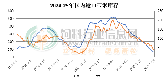 截至9月26日北方港口四港玉米庫存共計約65萬噸。北方港口新糧陸續集港,庫存降至同期較低水平。截止周五廣東港口玉米庫存37萬噸,飼企觀望心理增強,整體采購量仍維持低位,以執行前期合同為主,內貿玉米日均出貨在3.6萬噸。