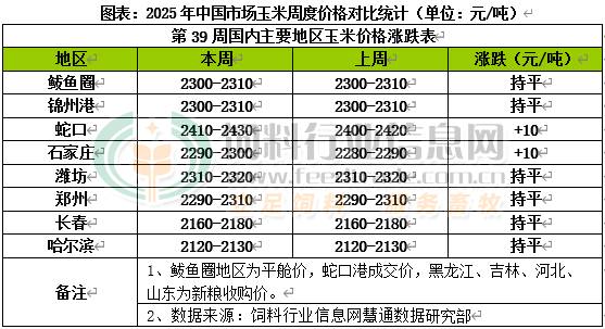 國內新季玉米陸續上市供應市場,受陰雨天氣影響,新玉米收割進度放緩,上市量相對偏低,而雙節用糧企業適量備貨,采購積極性良好,支撐現貨價格震蕩回調。東北新季玉米供應較為充足,北方港口新糧集港量持續增多,貿易商對新季市場預期較低迷,囤糧意愿低迷,購銷心態相對謹慎,其中錦州港周比持平;南方港口玉米庫存持續下滑,而雙節臨近飼料企業備貨有所積極,在成本及節前備貨需求支撐下貿易商報價堅挺,其中蛇口港周比上漲10元/噸。國內玉米現貨價格基本穩定,局部價格小幅上體。東北產區深加工企業開秤價高于上年同期,種植戶售價仍有利潤空間,部分種植戶提前收割鎖定利潤,由于玉米水分偏大烘干成本高,貿易商建庫意愿不強,隨收隨走為主。隨著新糧上市數量增加,深加工企業廠門到貨量提升,深加工企業連續大幅下調潮糧收購價,其中哈爾濱周比持平;華北黃淮產區受陰雨天氣影響,新玉米收割進度放緩,東北糧入關的數量減少,市場糧源流通量繼續減少,深加工企業廠門到貨處于低位,少數企業價格繼續偏強調整,其中石家莊周比上漲10元/噸。