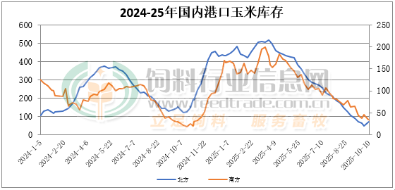 截至10月10日北方港口四港玉米庫存共計約70萬噸。北方港口新糧陸續集港,庫存小幅增加。截止周五廣東港口玉米庫存32萬噸,飼企以執行前期合同為主,新簽訂單偏少,內貿玉米日均出貨在3.5萬噸。