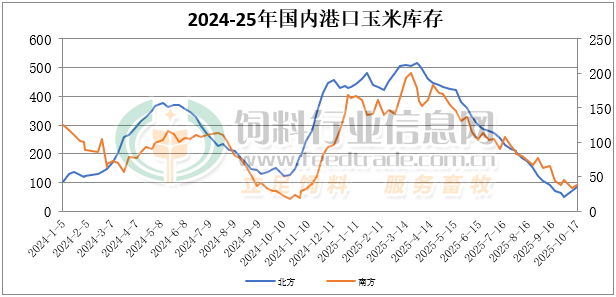 截至10月17日北方港口四港玉米庫存共計約82萬噸。北方港口集港量維持高位,貿易商走貨速度一般,庫存繼續增加。截止周五廣東港口玉米庫存38.7萬噸,飼企以執行前期合同為主,維持觀望態度,內貿玉米日均出貨在3.7萬噸。