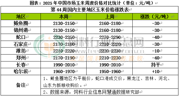 國內主產區新玉米收獲進入尾期,基層種植戶售糧意愿提升,糧源上市量增加,供應壓力快速累積,深加工企業持續收購,下游養殖利潤倒掛,飼企備貨謹慎,市場整體供過于求,玉米價格以弱勢震蕩為主。東北產地新糧上量壓力逐漸顯現,北方港口晨間集港量小幅增多,南北發運利潤倒掛也制約貿易商收購積極性,貿易商收購價小幅走弱,其中錦州港周比下跌40元/噸;南方港口谷物庫存維持高位水平,市場情緒低迷,飼企采購遠期合同為主,現貨成交清淡,貿易商報價走弱,其中蛇口港周比下跌40元/噸。國內玉米現貨價格基本穩定,局部價格震蕩走低。東北產區天氣良好新玉米增產幅度較大,種植戶出售心態較好,貿易商建庫速度相對遲緩,而烘干塔多以隨收隨走,用糧企業尚未大規模補庫,階段性供應繼續壓制玉米價格,但中儲糧直屬庫陸續啟動收購,對現貨行情有所支撐,其中長春周比持平;華北黃淮產區天氣晴好新玉米收割進度顯著加快,上市新糧水分較高霉變粒多,貿易商收購意愿較弱,多隨收隨走,干糧、優質糧供應相對有限,市場供應仍以潮糧為主,飼料企業擇優采購新糧或增加采購東北玉米,深加工企業廠門到貨量維持高位,企業繼續壓價收購,其中石家莊周比下跌30元/噸。
