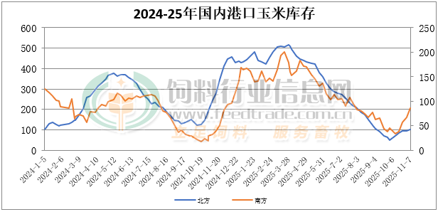 截至11月7日北方港口四港玉米庫存共計約102萬噸。北方港口新糧集港多為遼寧地區糧源,吉林、黑龍江農場糧并未大量上市。截止周五廣東港口玉米庫存87萬噸,終端提貨居多,整體新成交仍較少,內貿玉米日均出貨在3.6萬噸。