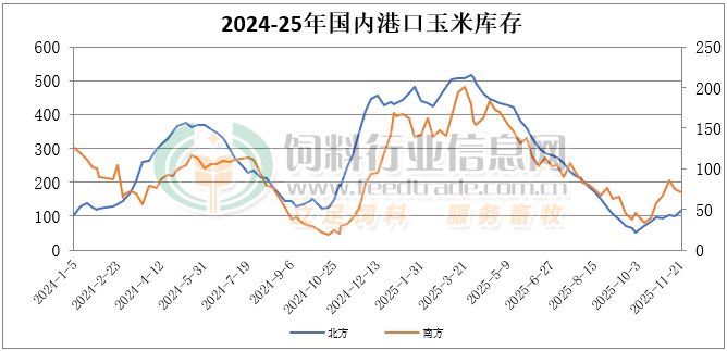 國內主產區氣溫下降低新糧易儲存影響,基層種植戶惜售情緒仍存,售糧進度有所放慢,而貿易環節積極收購,養殖企業處于增肥階段,飼企備貨增加,利潤支撐加工企業需求增加,現貨價格延續上漲走勢。東北產區糧源發北港已開始順價,北方港口到貨逐漸增量,等待裝運船期密集,貿易商收購價格小幅上調,其中錦州港周比上漲5元/噸;受北方港口偏強行情提振,南方港口到貨成本增加,貿易報價趨強,其中蛇口港周比上漲50元/噸。國內玉米現貨價格基本穩定,局部價格繼續走高。東北產區整體售糧進度約兩成,其中遼寧售糧進度過五成多,吉林售糧進度一成多,黑龍江售糧進度二成多,內蒙古售糧進度一成多。受寒潮天氣影響氣溫繼續降低,加上部分區域進入上凍周期,種植戶惜售心態有所顯現,玉米外流數量增加,部分貿易商收糧的積極性也有所提高,飼料企業庫存同比偏高,隨買隨用,深加工企業建庫緊迫感提高,收購價格繼續偏強,其中長春周比上漲20元/噸;華北黃淮產區基層整體售糧進度兩成多,其中河南售糧進度過二成半,山東售糧進度近三成,河北售糧進度一成多,山西售糧進度約二成。雨雪天氣影響基層種植戶種植冬小麥進度,惜售情緒升溫,玉米出售節奏也較前期放緩,貿易商存貨積極性一般,出貨多隨行就市,市場收購量維持低位,深加工企業到貨量尚可,能夠滿足企業日常需求,收購價格漲勢明顯放緩,其中石家莊周比上漲20元/噸。