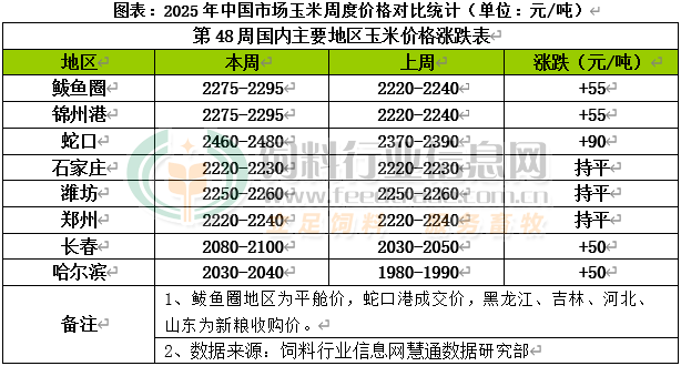 國內主產區雨雪天氣來臨加重東北糧運力緊張狀態,市場看漲情緒升溫,流通糧源供應相對緊張,用糧補庫需求導致階段性供應偏緊,繼續支撐玉米價格偏強運行。隨著東北產地玉米價格的上漲,多數產區發北港已順價,北方港口集港量小幅回升,船期保持密集態勢,在集中發運支撐下,價格維持偏強態勢,其中錦州港周比上漲55元/噸;南方港口受北港收購價格大幅上漲,到貨成本高企,內貿玉米供應趨緊,貿易商報價走強,其中蛇口港周比上漲90元/噸。國內玉米現貨價格基本穩定,局部價格繼續走高。東北產區基層售糧進度同比微偏快,低溫利于新糧存放,種植戶售糧積極性暫不高,挺價意愿較強,上貨量仍顯一般,物流限制的持續影響,市場看漲情緒升溫,加劇了下游的采購緊迫感,用糧企業也在加大采購力度,收購價格繼續偏強,其中長春周比上漲50元/噸;華北黃淮產區經過前期玉米價格不斷上調,基層種植戶售糧積極性小幅回升,但新糧質量相對分化,部分糧源霉變率偏高,貿易商收購較為謹慎,優質糧供應不多,飼料企業采購東北優質玉米摻兌來加工,深加工企業庫存水平偏低,根據到貨情況調整收購價格,其中石家莊周比持平。