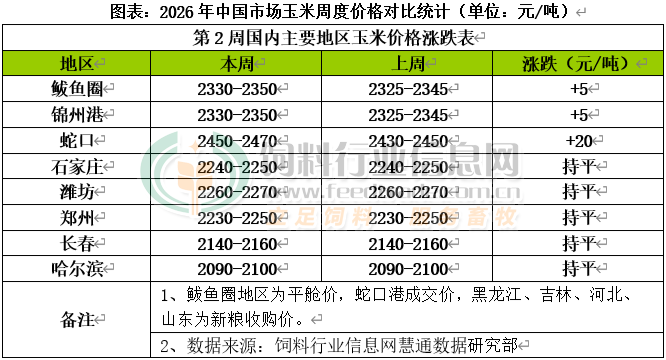 國內主產區基層種植戶惜售情緒尚未消退,而中儲糧玉米銷售明顯放量,進口玉米投放也在持續,供應緊張局面有望得到有效緩解,市場追高熱情開始降溫,用糧企業維持相對安全庫存,按需采購為主,現貨價格維持窄幅區間內盤整。北方港口貿易商提價促收后,集港量有所恢復,到貨量呈增長趨勢,貿易商在春節前積極裝船,觀望情緒逐漸濃厚,其中錦州港周比上漲5元/噸;南方港口進口玉米、高粱、大麥等替代谷物持續到港,庫存逐漸累積,飼料企業執行前期合同,到港成本支撐貿易商報價心態,其中蛇口港周比上漲20元/噸。國內玉米現貨價格基本穩定,局部價格小幅上調。東北產區儲備玉米投放陸續增多,基層種植戶有惜售現象,糧源上量緊張,貿易商收購進度偏緩,外銷情況稍顯一般,貿易商高價建庫意愿不強,飼料企業庫存維持正常水平,深加工企業庫存同比偏低,部分加工企業再度上調收購價,其中長春周比持平;華北黃淮產區元旦假期后基層玉米上量逐步恢復,市場供給壓力有所增加,部分深加工企業收購價格小幅下降,壓價行為導致種植戶售糧節奏放慢,干糧收購量一般,貿易商出貨節奏相對遲緩,市場上量有所減少,用糧企業庫存有所上升,維持隨采隨用模式,收購價格繼續小幅調整,其中濰坊周比持平。