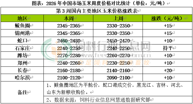 國內主產區基層種植戶售糧心態略有松動,市場流通糧陸續逐漸增加,中儲糧采購力度顯著加碼,下游企業存在年前備貨需求,持續推升現貨價格走勢,不過進口玉米拍賣和儲備糧輪換持續,進口玉米等谷物仍有替代優勢,限制現貨進一步上漲空間,現貨價格維持窄幅偏強盤整。北方港口降雪天氣使集港上量節奏受阻,飼企年前備貨需求下,船期存在增加趨勢,支撐價格小幅偏強,其中錦州港周比上漲15元/噸;南方港口替代谷物陸續到貨,庫存不斷積累,飼料企業基本已建立安全庫存,飼企執行前期合同為主,成本支撐貿易商報價相對堅挺 ,其中蛇口港周比上漲10元/噸。國內玉米現貨價格基本穩定,局部價格小幅上調。東北產區基層售糧進度同比偏快,余糧減少,受近日來期貨價格持續上漲提振,市場看漲預期顯著增強,未出現規模性上量,內蒙古、吉林等地中儲糧拍賣投放,對市場供應有所補充,用糧企業利潤不佳,持續提價收糧動力不足,行情小幅偏強運行,其中哈爾濱周比上漲10元/噸;華北黃淮產區基層種植戶售糧積極性略有提升,但市場流通糧源水分偏高,優質干糧供應有限,整體售糧進度仍較慢,用糧企業加工利潤虧損,原料庫存回升安全線上,對高價接受度有限,以剛需采購為主,收購價格繼續偏強波動,其中濰坊周比上漲10元/噸。