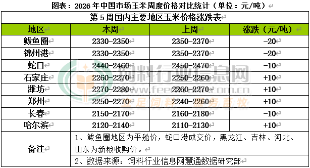 國內主產區種植戶有序售糧,余糧出售速度加快,企業在節前仍有補庫需求,采購節奏保持平穩,現貨行情延續震蕩略強態勢。北方港口貿易商提價收購后,集港量維持在相對高位水平,下游采購需求減少,疊加期貨盤面走弱,貿易商收購態度偏謹慎,收購價格小幅走弱,其中錦州港周比下跌20元/噸;南方港口到貨船期增加,進口高粱、大麥價格優勢凸出,飼料企業采購較多,擠占內貿玉米的需求,飼料企業多執行前期合同,持續備貨情緒不高,貿易商報價小幅下跌,其中蛇口港周比下跌10元/噸。國內玉米現貨價格基本穩定,局部價格小幅震蕩。東北產區隨著年關臨近,基層種植戶售糧心態松動,出糧速度較前期偏快,深加工企業及飼料企業庫存已升至一個月以上,多以隨用隨采為主,供應增量不多,收購價格窄幅波動,其中哈爾濱周比上漲10元/噸;華北黃淮產區隨天氣轉晴運輸改善,基層售糧節奏有所加快,當前售糧進度已超五成,種植戶對優質糧仍存惜售心態,市場流通量維持低位,貿易商節前擇優建庫,隨著庫存逐漸增多,多數深加工企業已建立安全庫存,采購觀望情緒明顯升溫,收購價格隨到貨情況靈活調整,其中濰坊周比上漲10元/噸。